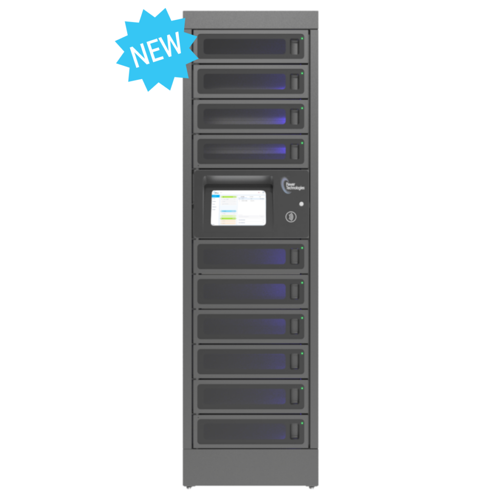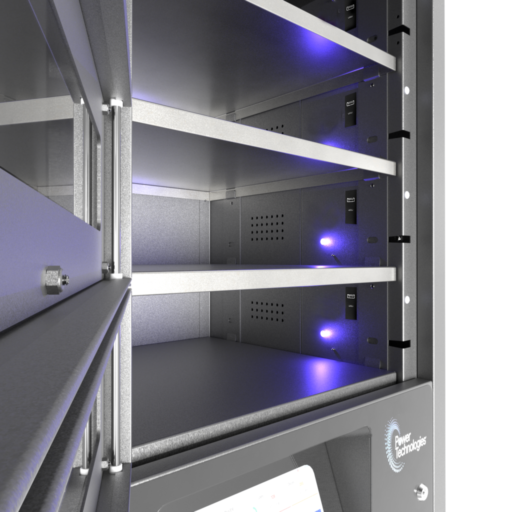 Der Smart Charging Locker erkennt jedes angeschlossene Gerät und meldet Lade- sowie Nutzungsstatus direkt ins zentrale Dashboard.