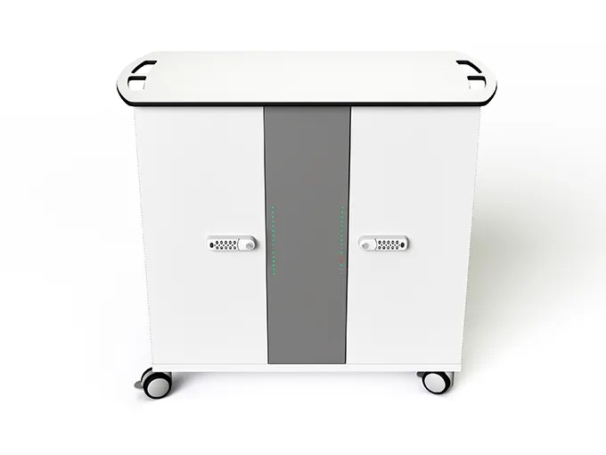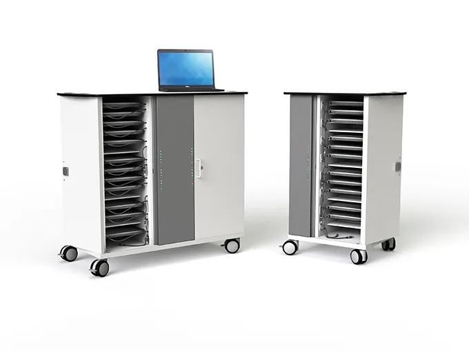Der Wagen bietet Platz für bis zu 32 Chromebooks, Tablets oder kleine Laptops mit einer Bildschirmgröße von bis zu 14 Zoll. Auch Geräte mit Schutzhüllen oder Tastatur-Covern können problemlos untergebracht werden.